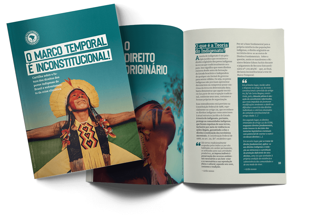 Acesse a cartilha da APIB sobre o Marco Temporal e saiba mais sobre a tese, o histórico de enfrentamento e a mobilização do movimento indígena